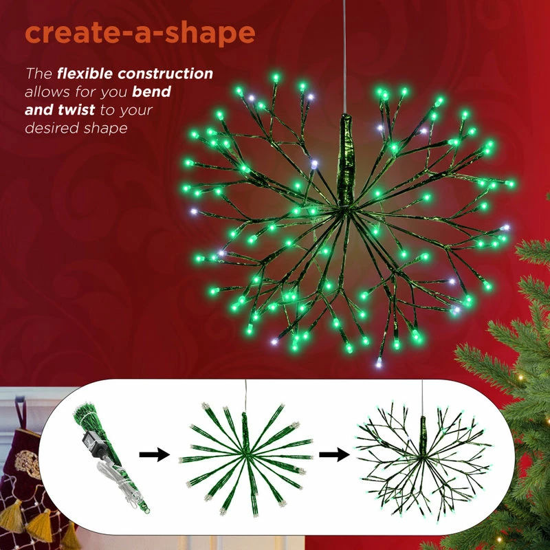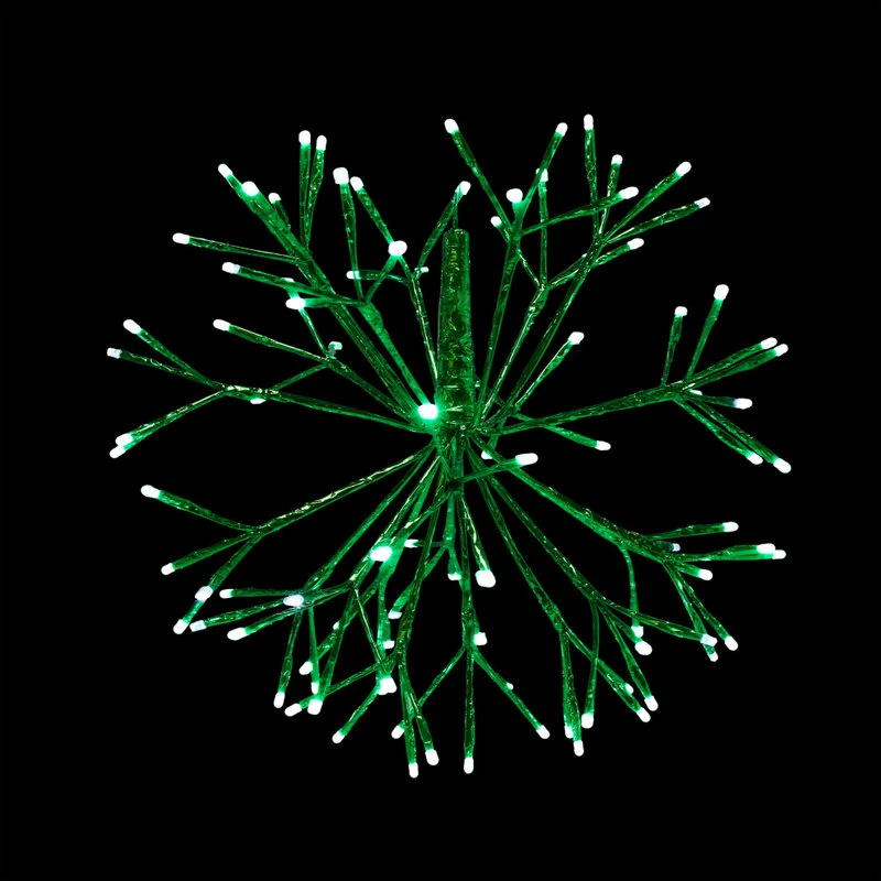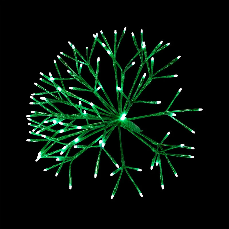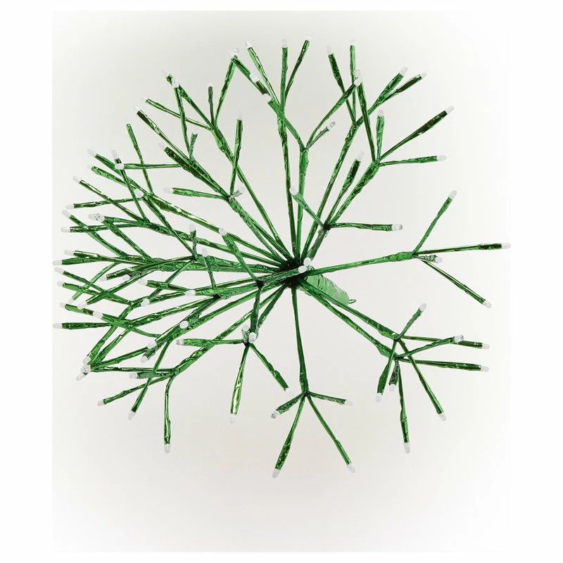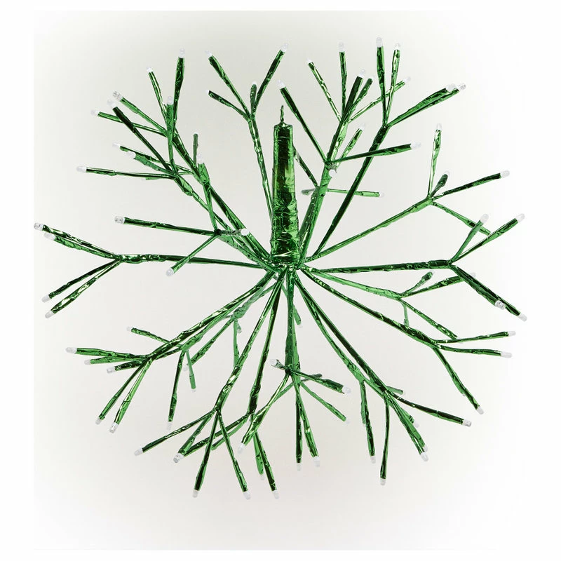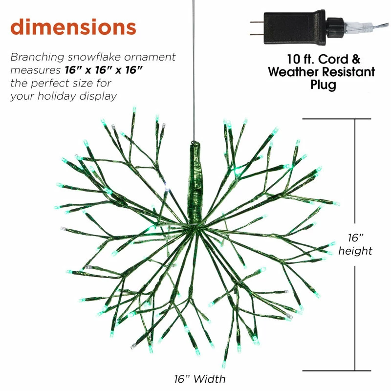 Upgrade your holiday decor with Alpine’s Hanging Snowflake Ornament! This ornament has a branching snowflake and is wrapped with green tape for a unique and stylish appearance. It features 84 green LED lights and 12 white flashing bulbs to provide a stunning nighttime display. It includes a UL approved transformer for easy use throughout your home. Hang on your Christmas tree, by your stockings, or simply over a door! Measuring 16″ x 16″ x 16″, Alpine’s Hanging Snowflake Ornament is the perfect addition to your holiday decor.