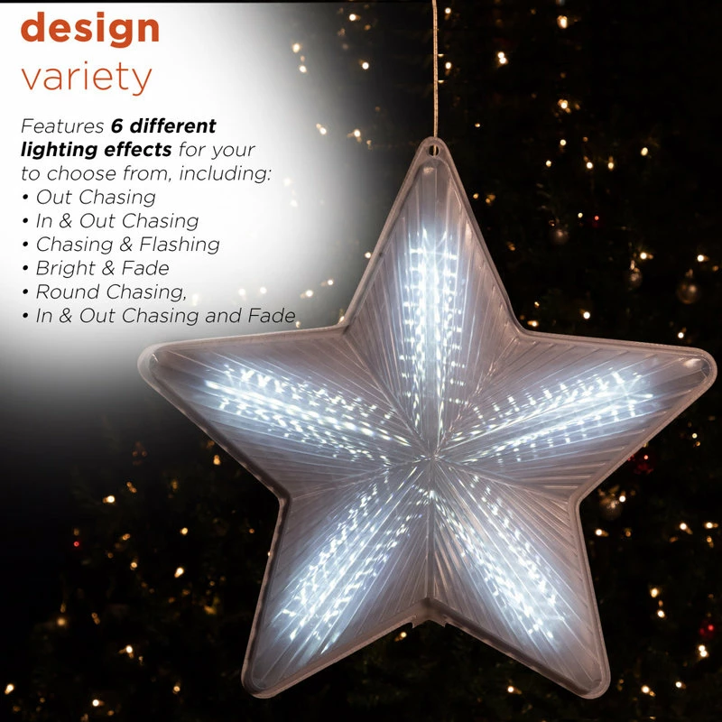 Upgrade your holiday decor with Alpine’s 3D Hanging Star Ornament! This white star ornament is perfect for your festive display. It features 60 color-changing LED lights for stunning lighting effects to brighten your home. It includes 6 unique lighting functions: Out chasing, in and out, chasing, chasing and flashing, bright and fade, round chasing, in and out chasing and fade. Turn it on to add a colorful flavor to your Christmas tree or creating a fascinating display. Constructed of durable metal and plastic, this ornament is built for lasting use. Hang around your home or on your Christmas tree! Alpine’s 3D Hanging Star Ornament measures 19″ x 2″ x 19″, perfect for your holiday decorations.
