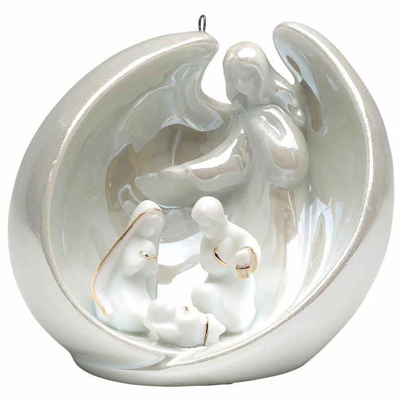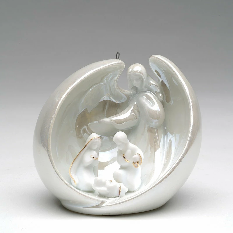 You’ll look forward to decorating your Christmas tree with this holy family heavenly angel nativity ornament year after year. It looks absolutely beautiful on any Christmas tree.. Measures 3 1/4 x 3 x 2 1/2 inches. Made of porcelain. Gift boxed, imported