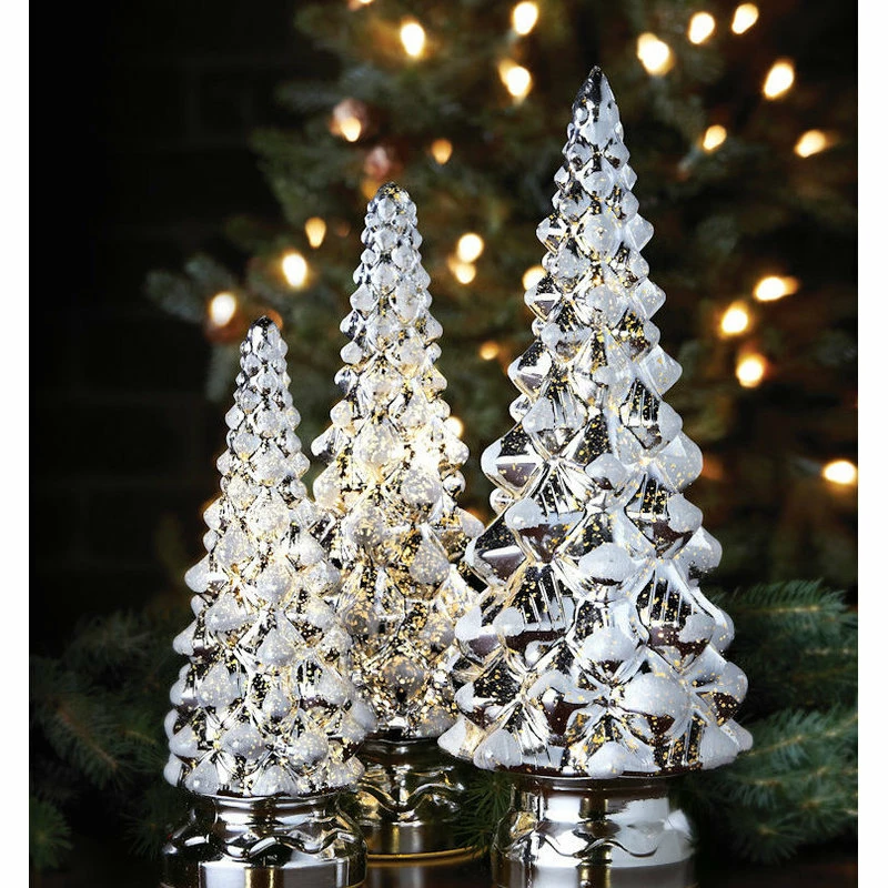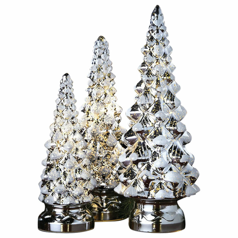 - STUNNING SILVER CHRISTMAS TREE TRIO – Set of three small Christmas tree glass figurines have sparkly, snow-tipped branches. LED lights tucked inside each mercury glass Christmas tree makes them twinkle and glow.