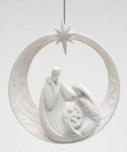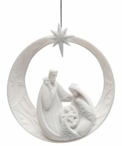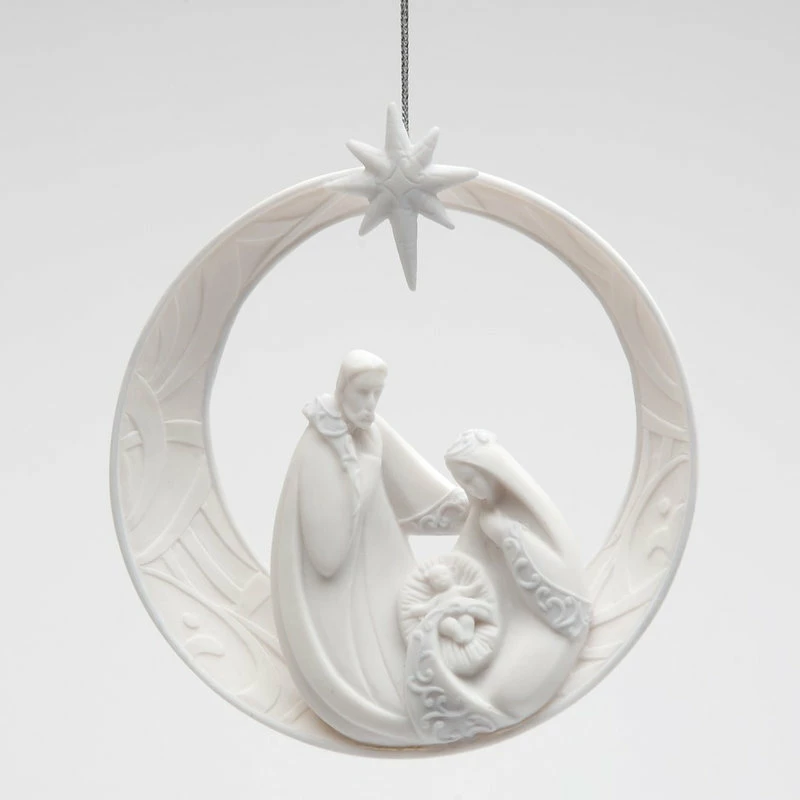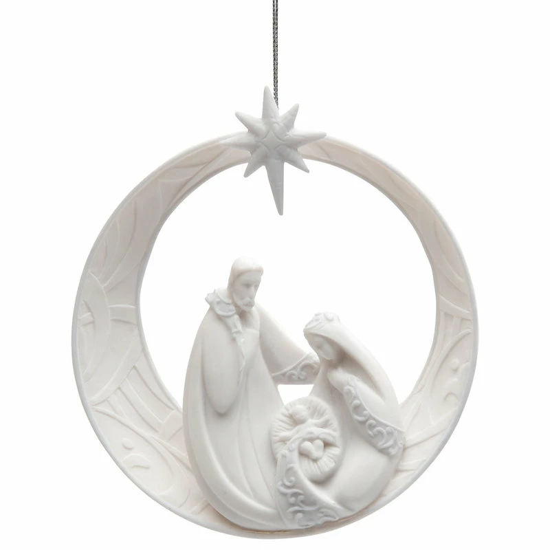 Decorate a Christmas tree with the stunning Holy Family Ornament. Featuring a miniature nativity scene and North star decoration, this white ceramic ornament is elegant and classic.