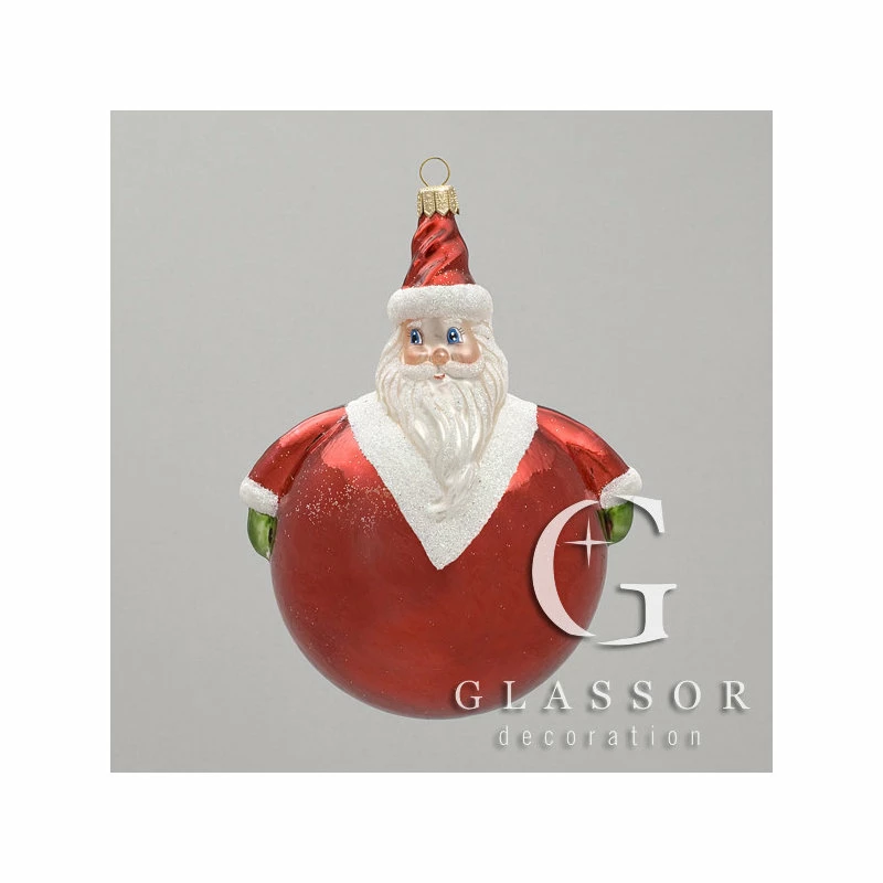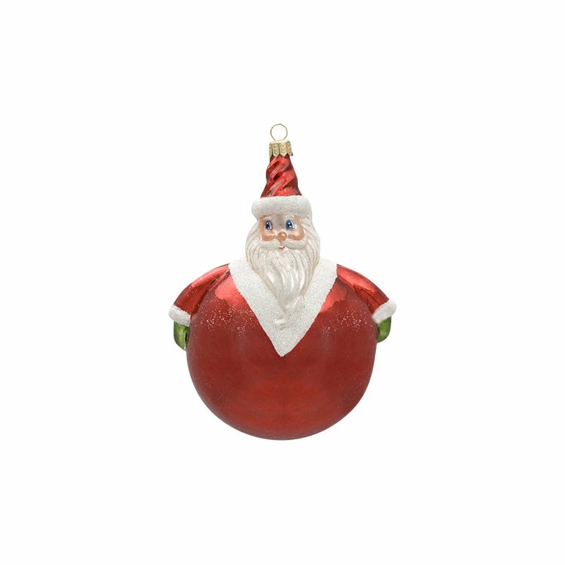 This whimsical take on a jolly Santa will add cheer to your Christmas tree: Larger 6.3″ glass Santa featuring a round ball belly and a traditional Santa head, hat, and gloves — all in red and white Double-boxed for shipping. Hand blown and hand painted