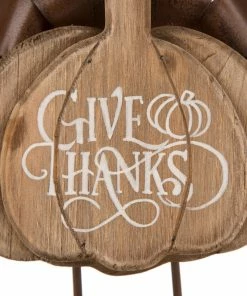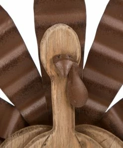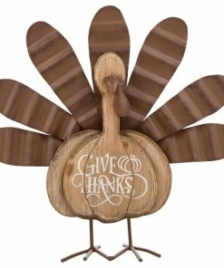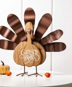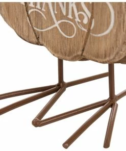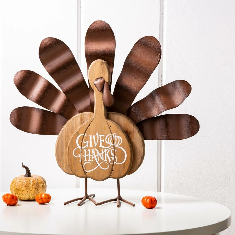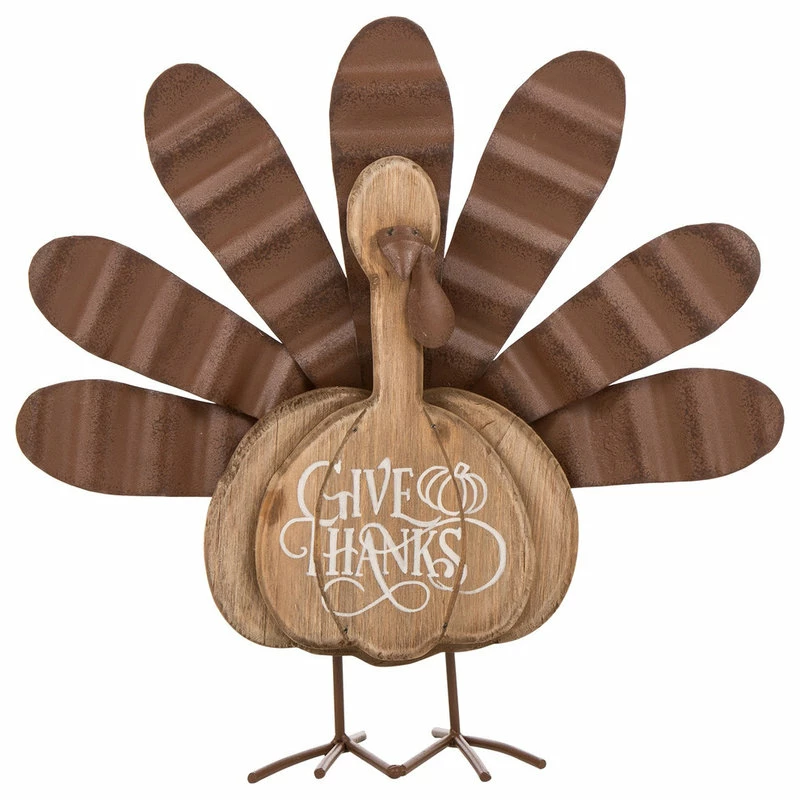 Its a standing turkey for thanks giving. The turkey has metal tail, metal claws and wooden body. The turkey stands on sturdy metal legs.It is write Give Thanks in white on the body.This charming pieces look great anywhere, whether set along your dining room table or on the living room mantel.