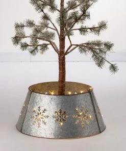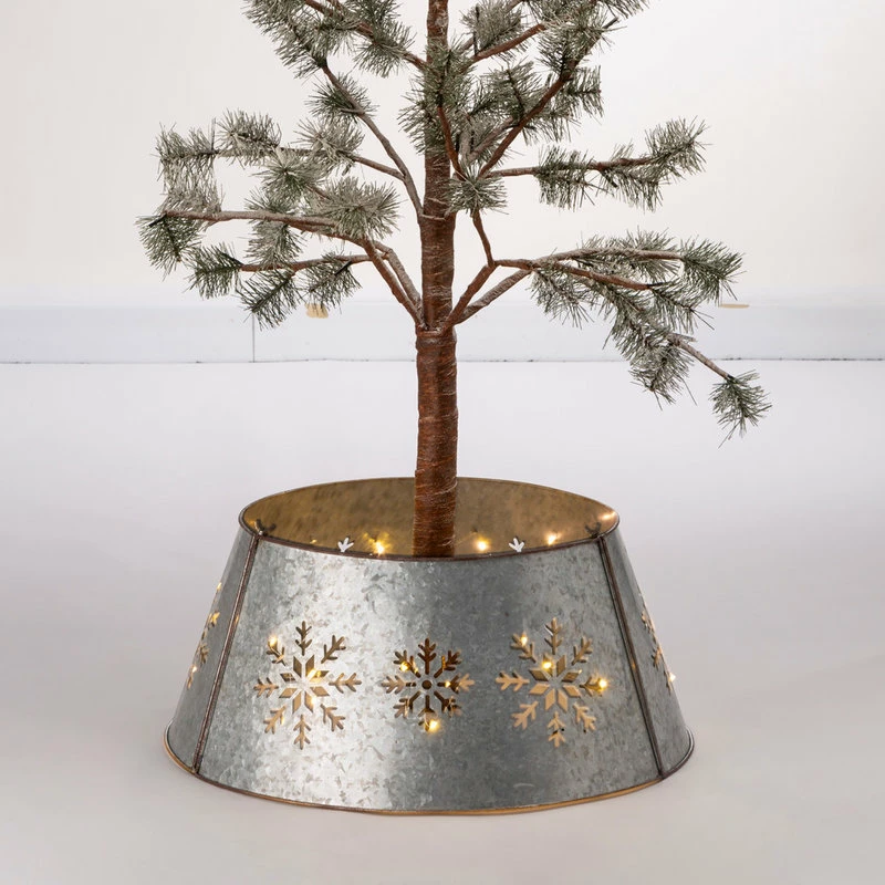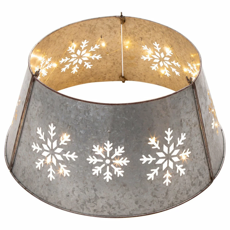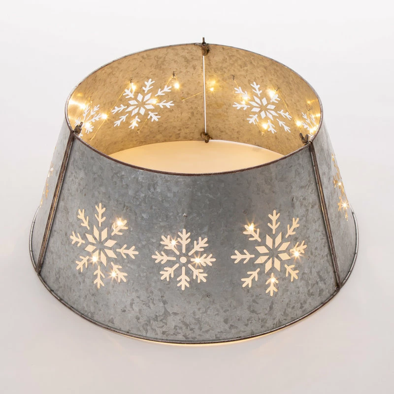 Add the final touch to your country Christmas with galvanized snowflake tree collar with lights string . It slightly flares out toward the base, which creates simple framing and covers the tree’s stand. Rustic replacement for the traditional tree skirt .Create a unique look for your Christmas tree this year with this Rustic Tree Collar. This unique collar gives the tree a rustic look while maintaining the holiday spirit.
