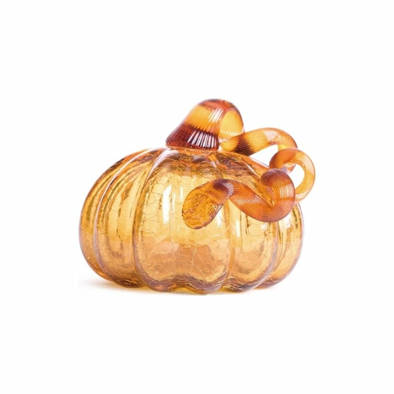 This amber colored glass pumpkin is 100% handmade by a professional crafter using molting the glass with a hollow steel tube in extremely high temperatures. Shaped by rolling the hot glass on a marver and then blown into the pipe tube to make the glass expand until the parison is created. Because they’re hand made in this method each glass pumpkin will have its own unique color hue and size. Spice up your fall decor with this amber crackle glass pumpkin. This unique glass pumpkin is perfect for getting your home ready to celebrate Halloween and it will keep your home festive all the way through Thanksgiving and beyond.