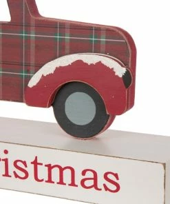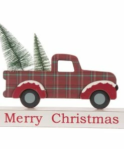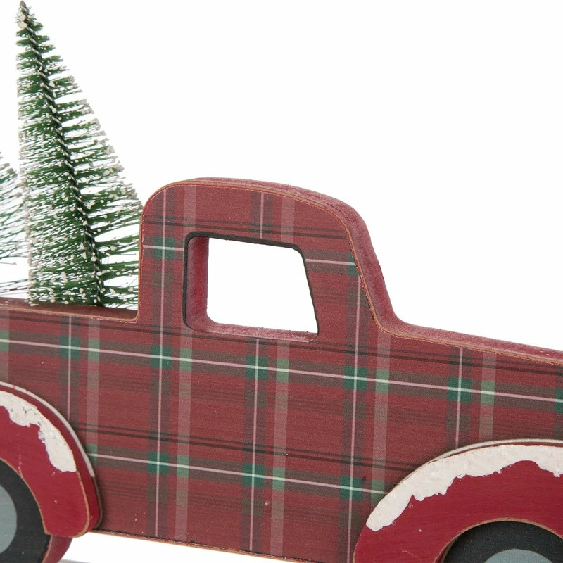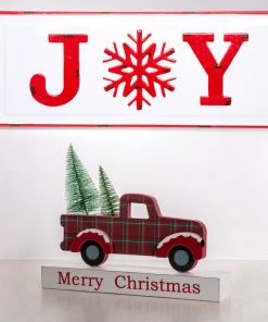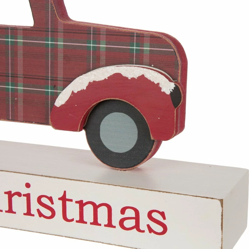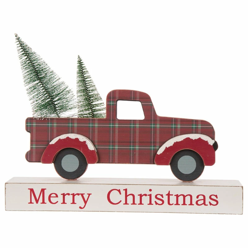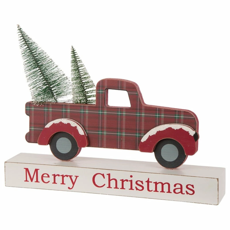 Displayed in bold red letters is the message “Merry Christmas” on base, while the pickup truck is feature in the holiday colors of red and green plaid with traditional Christmas tree decorate .