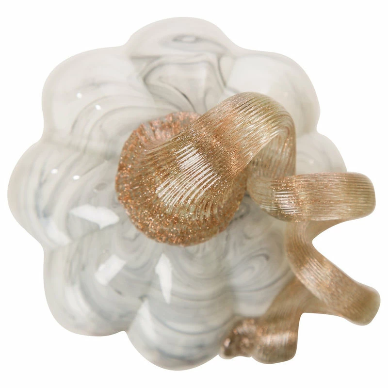 This glass pumpkin offers a unique display of gold and elegant white that stands out in any display setting. It is hand blown, making each piece unique in shape, color and design. The glittery stem spirals give a fancy touch whilst the final look results elegant and sophisticated. Get your Fall decor on!