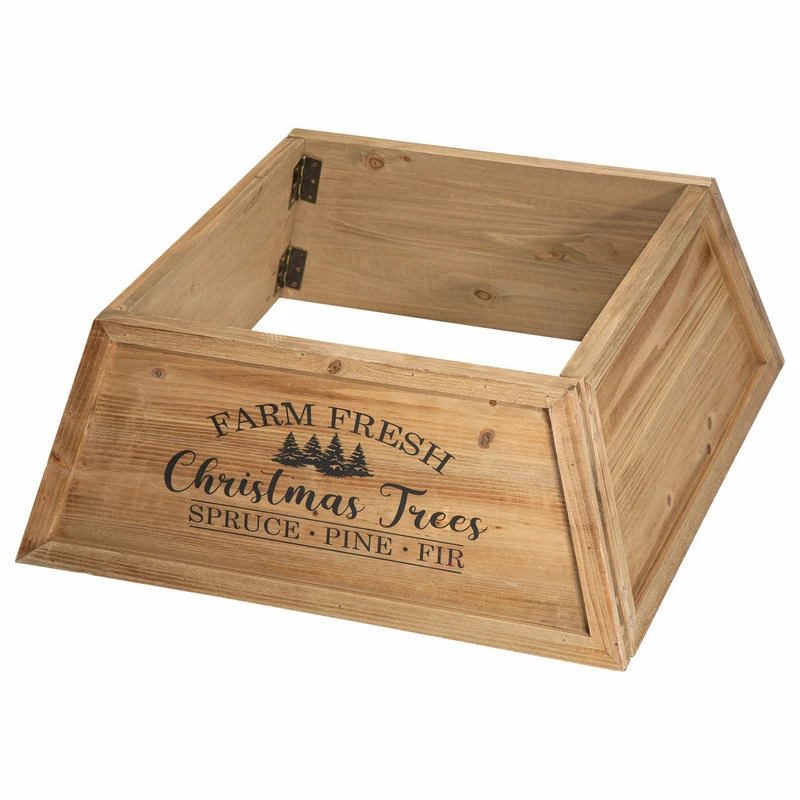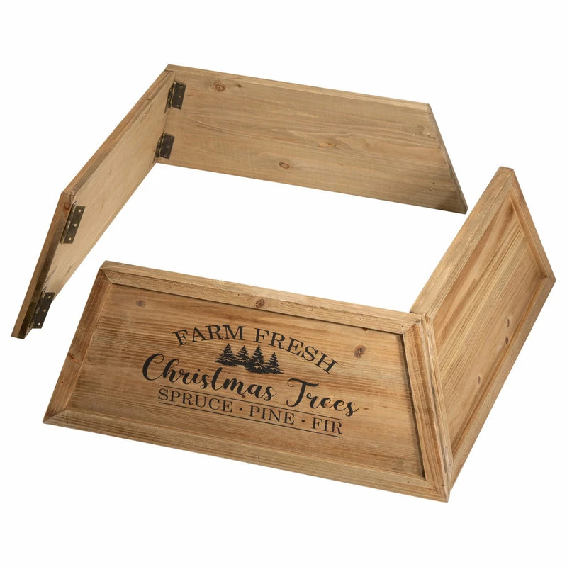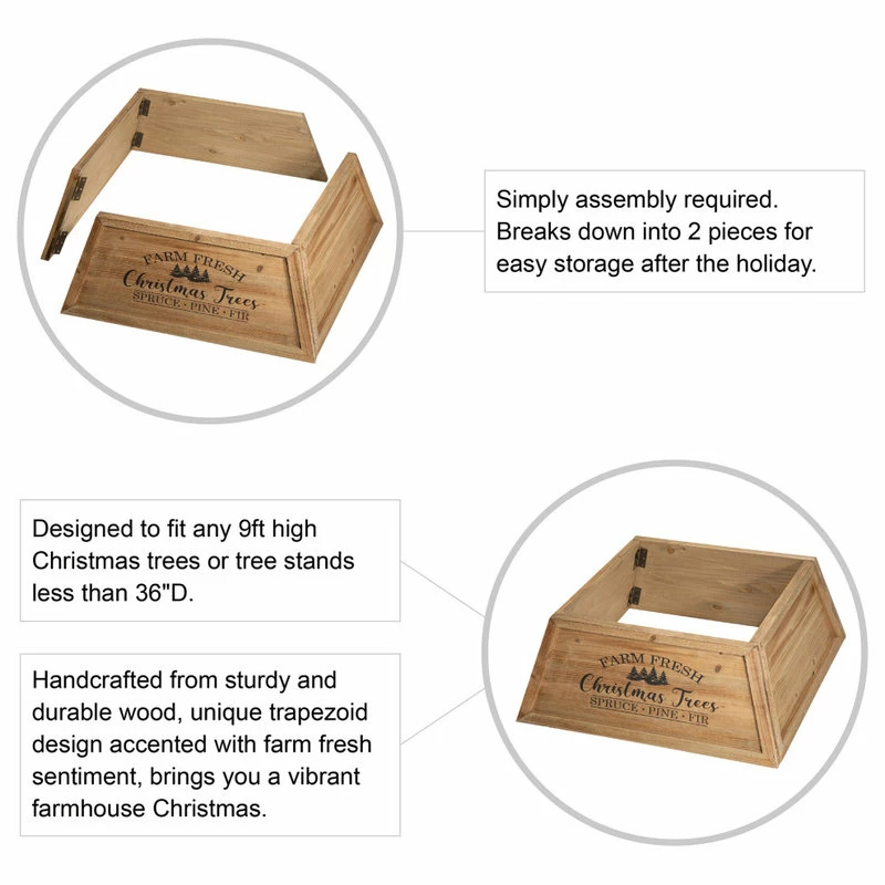 Our handcrafted tree box collars add a rustic, elegant charm to any home or business. The tree boxes not only add beauty and hide the undesirable parts of your tree, but they also prevent kids and pets from getting into the bottom side of your tree. They are made of solid wood. You will simply take the 2 side panels and lock them into the front panel. From there you can then slide your box into place in front of your tree. The trapezoididal design adds your tree with uniqueness.