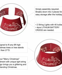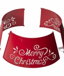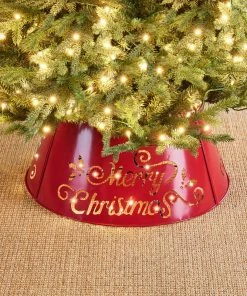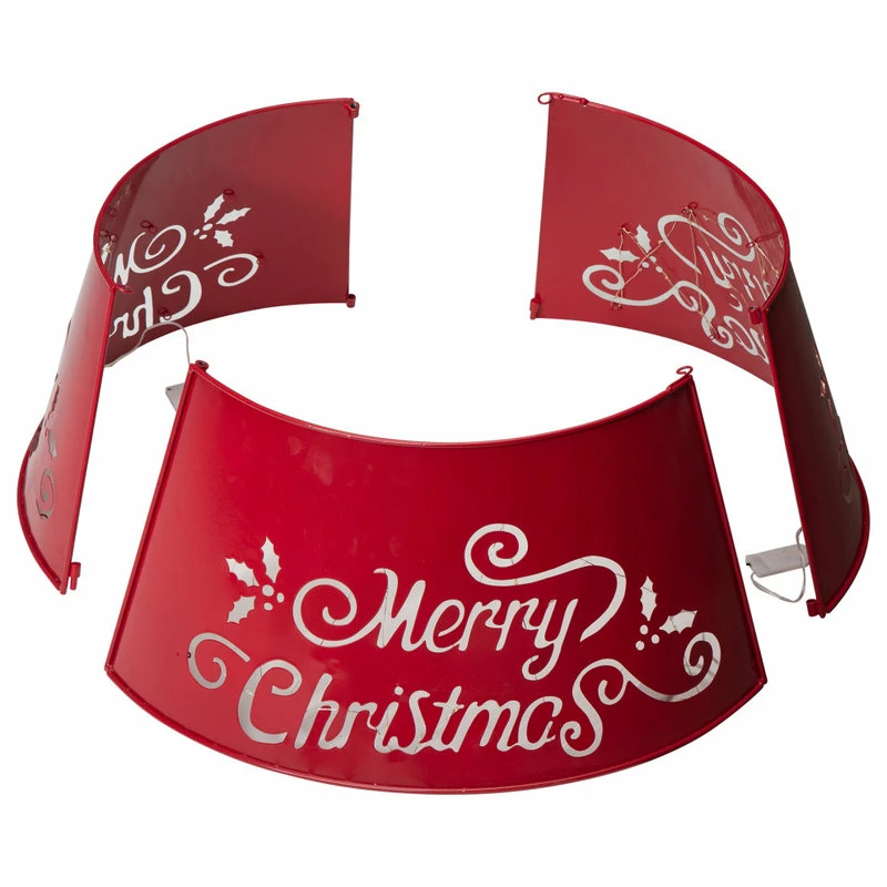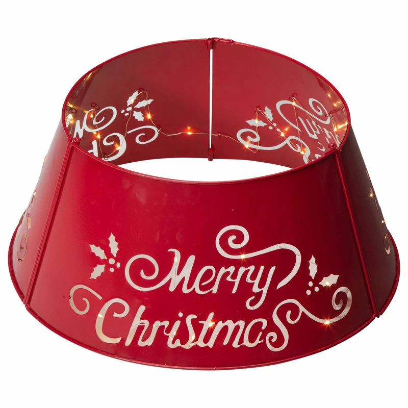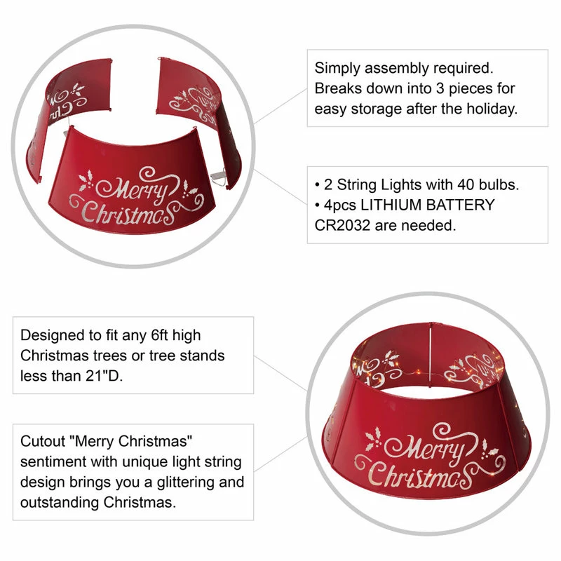Add the final touch to your country Christmas with Merry Christmas sentiment tree collar with lights string. It slightly flares out toward the base, which creates simple framing and covers the trees stand. Made from sturdy metal, you can use this collar for seasons to come.