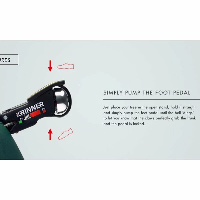 Finally, you and your family can have a stress-free Christmas season with the easy-to-use Krinner tree stands! Krinner’s Christmas Tree Genie XXL Deluxe is our most innovative stand. It comes with Krinner’s original single cable operation, which guarantees equal claw pressure around the trunk whether it’s thick or thin. Use the foot pedal to ratchet the claws. This stand boasts 5 claws that can be ratcheted tightly to secure the tree trunk. “Ding” technology tells you when the claws have securely closed around the tree. The patented safety belt: The ratchet mechanism opens step by step, so that the tree cannot fall over spontaneously. Another advantage is that the tree can be readjusted easily and safely. Keep your tree fresh and looking great as the Tree Genie XXL holds up to 2.5 gallons of water! Setting a tree up just got easier! Simply place your tree in the stand, hold it straight and step on the foot pedal until the bell rings.