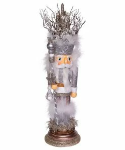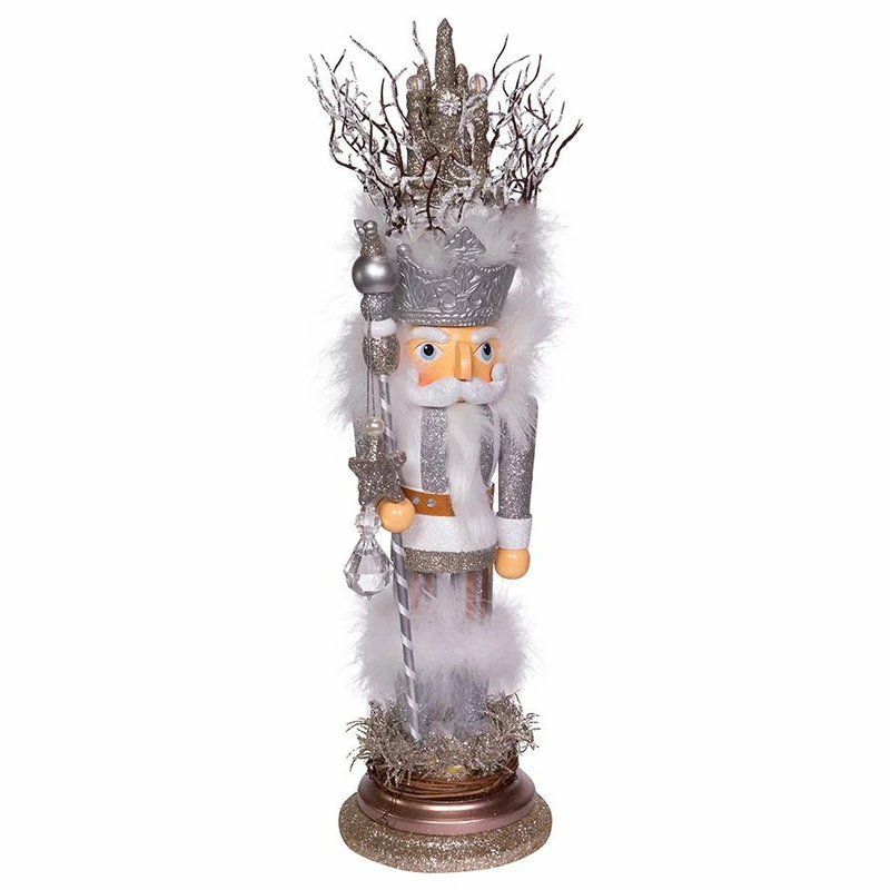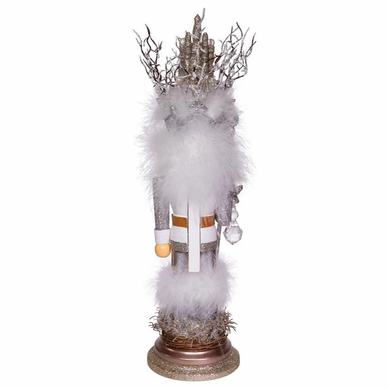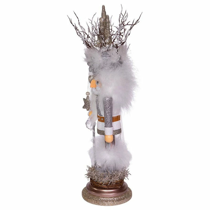 Hollywood Nutcrackers is a whimsical collection of nutcrackers created exclusively for Kurt S. Adler, Inc. and features an assortment of designs that put a unique, vibrant, memorable twist on traditional nutcrackers. This 17.5-inch Hollywood Nutcracker is dressed in wintery white as he stands tall on a glittery wooden base. On his crown sits a miniature castle that’s surrounded by twigs from the woods of his home.