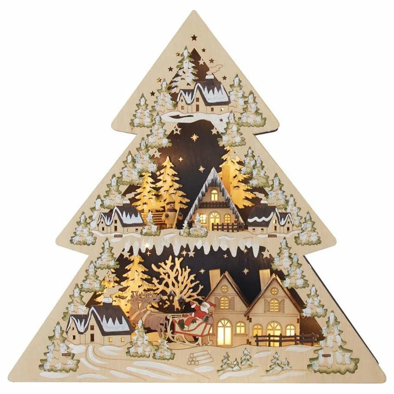 This 17-Inch Battery-Operated Light Up Wooden Tree Shaped Village from Kurt Adler is a beautiful and unique addition to any holiday decor. This table piece is in the shape of a tree and features multiple snowy villages. When switched on, this village lights up with LED lighting for a festive glow.