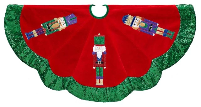Add the perfect finishing touch to your Christmas tree with this 48-inch velvet nutcracker tree skirt from Kurt Adler. Its red design features a thick green scalloped edge, and colorful nutcracker adornments throughout.