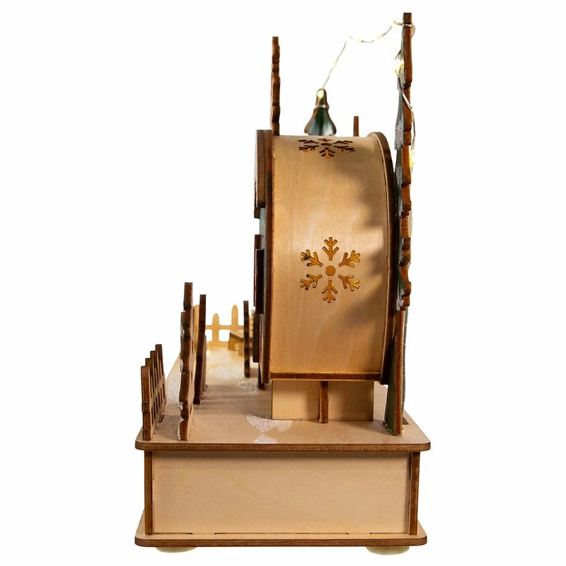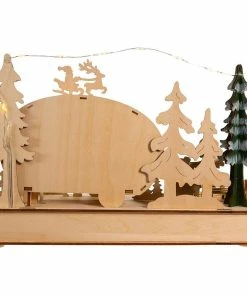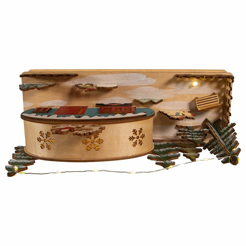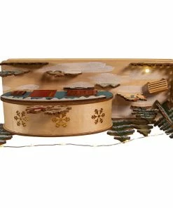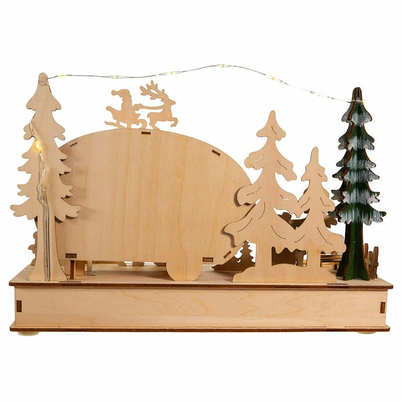 Add to your holiday lighting and decor with this 7.5-Inch Battery-Operated Wooden Light Up Camper with Santa scene. This table piece features a red and blue camper with snowy trees and a decorated base lit from within by 15 warm white incandescent lights for a soft and festive glow. It uses 2 “AA” batteries which are not included.