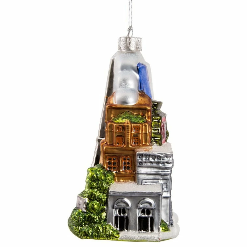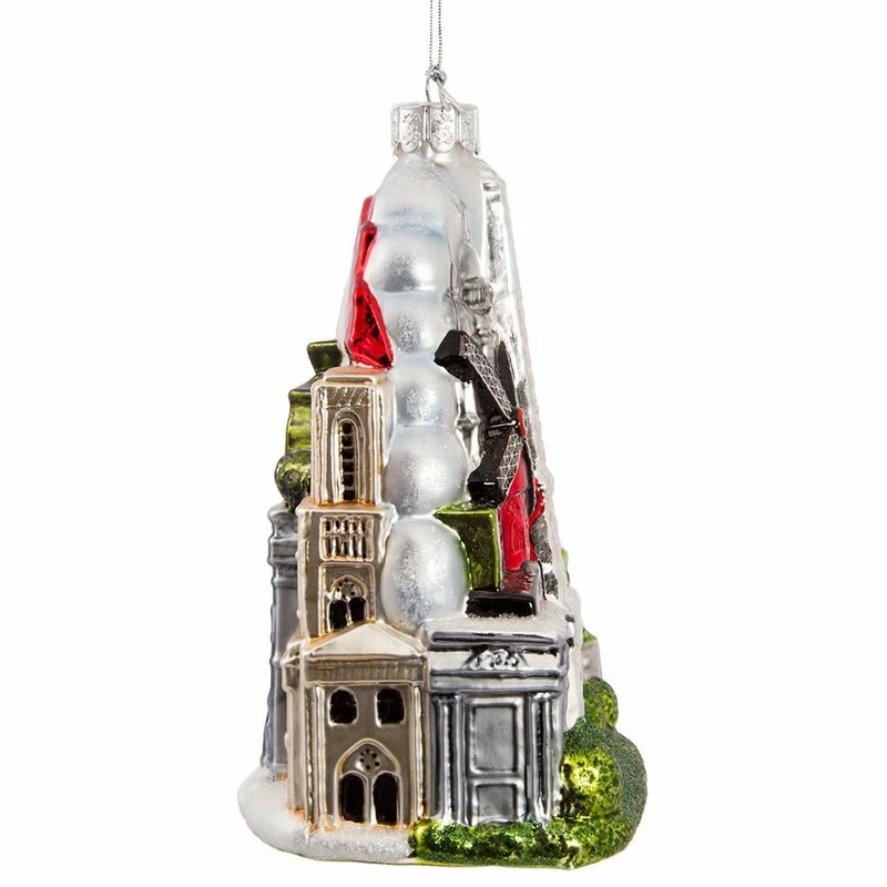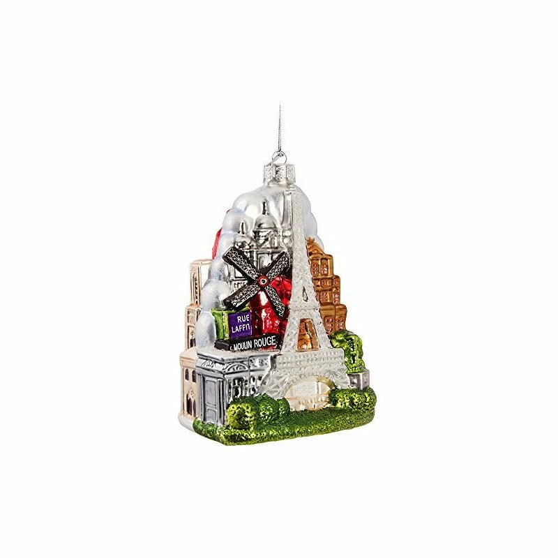 This hand-painted glass Paris city ornament is part of Kurt Adlers Cityscapes collection, which features beautiful glass ornaments that are commemorative of cities from around the world. This intricate ornament features the Eiffel Tower as its focal point, surrounded by the Arc de Triomphe, the Moulin Rouge and other major buildings and landmarks of Paris, all ornately painted and crafted. Perfect for travelers as momentos!