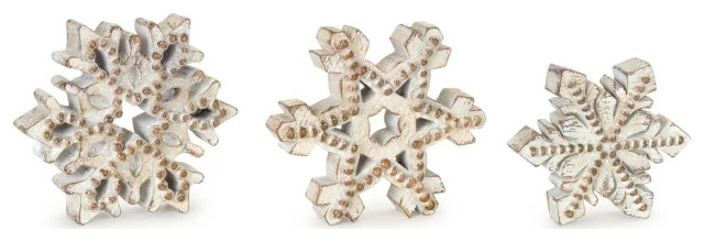 Thick, chunky snowflakes have a look of being hand-carved. Beaded accents have a timeworn look while chiseled edges are sanded to reveal the warm brown undertones.