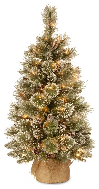 National Tree Company 3 feet Glittery Bristle Pine Tree with Battery Operated Warm White LED Lights. 3′ Glittery Bristle Pine Burlap Tree with 7 White Tipped Cones & 35 Warm White Battery Operated LED Lights w/Timer.