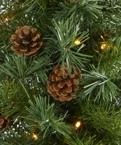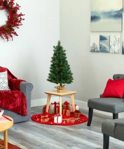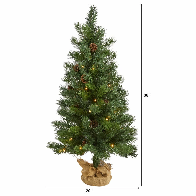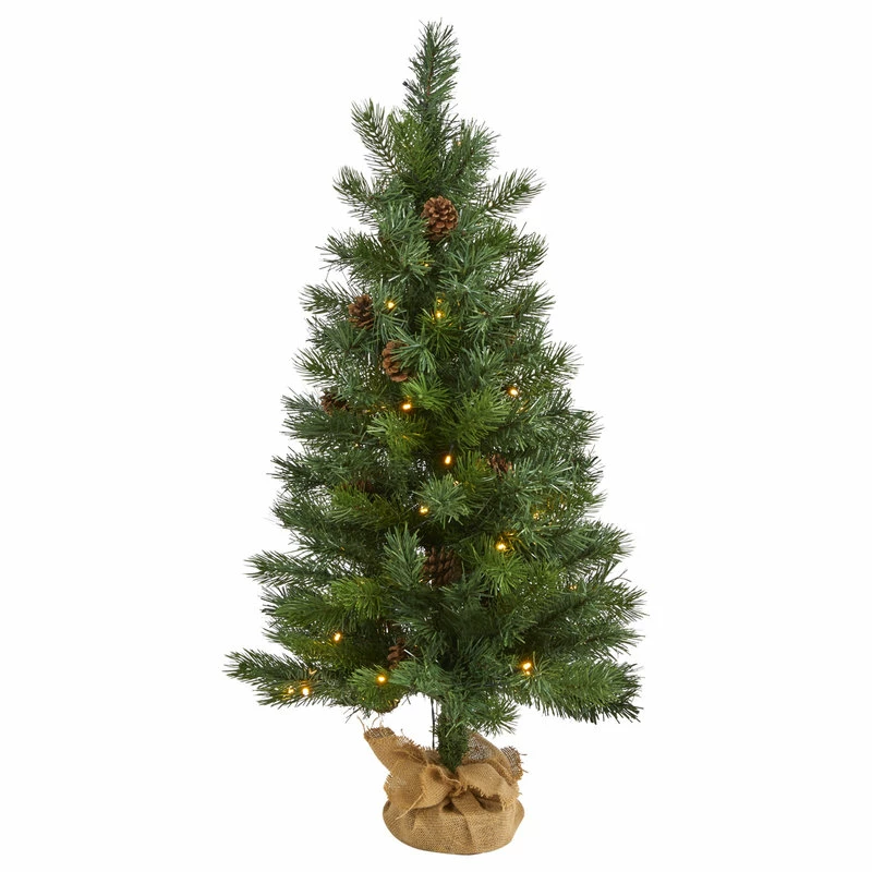 - 3′ Fraser Fir Natural Look Artificial Christmas Tree With 50 Clear LED Lights, Pinecones, a Burlap Base and 90 Bendable Branches