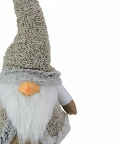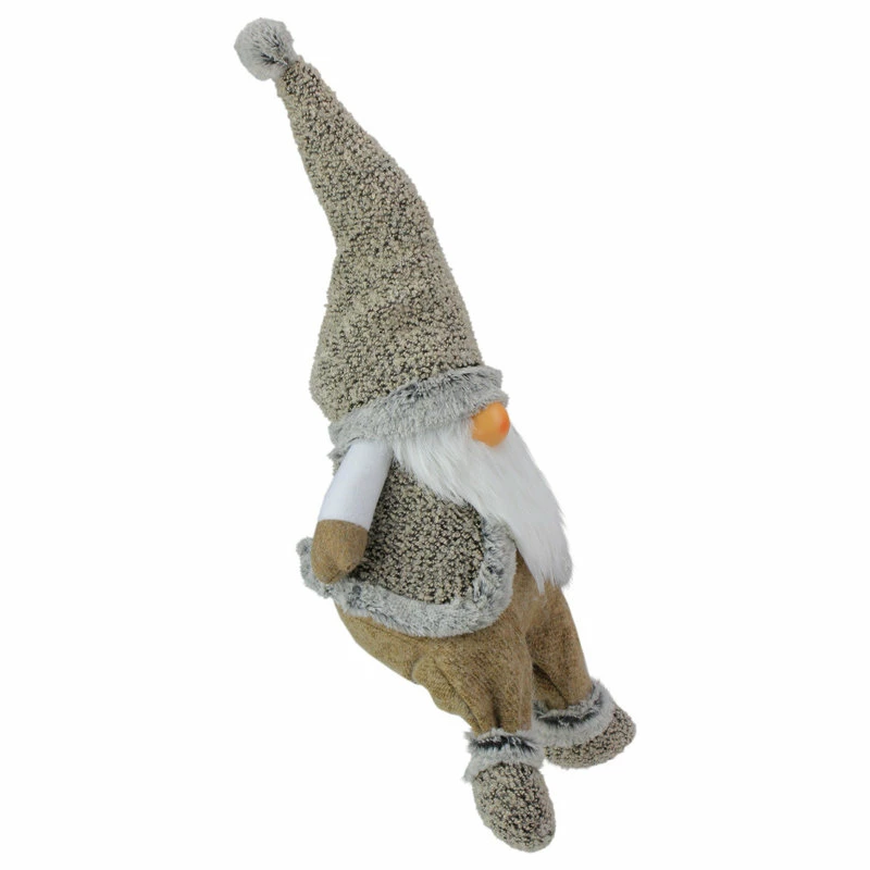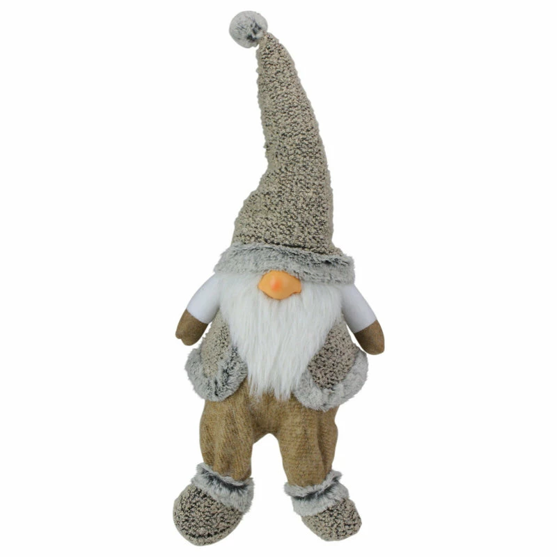 This gnome decoration is jolly and happily standing and needs a home this Christmas! This gnome has on a gray vest with beige pants on all while wearing a long matching heart hat with an attached pom-pom on the top! He has a full white faux fur beard matched with beige mittens and matching boots. Sit him up anywhere around your home or office for a perfect holiday display. Product Features: