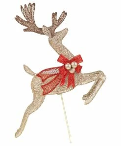 beautiful reindeer and sleigh lawn decoration.Product featuresSleigh Dimensions: 27″ H x 11.5″ W x 30″ LReindeer Dimensions: 42″ H x 4.5″ W x 27″ LThe package comes with one sleigh and two deerChampagne color with matching red bows150 Count Incandescent Clear Lights UL Listed LightsStakes Included