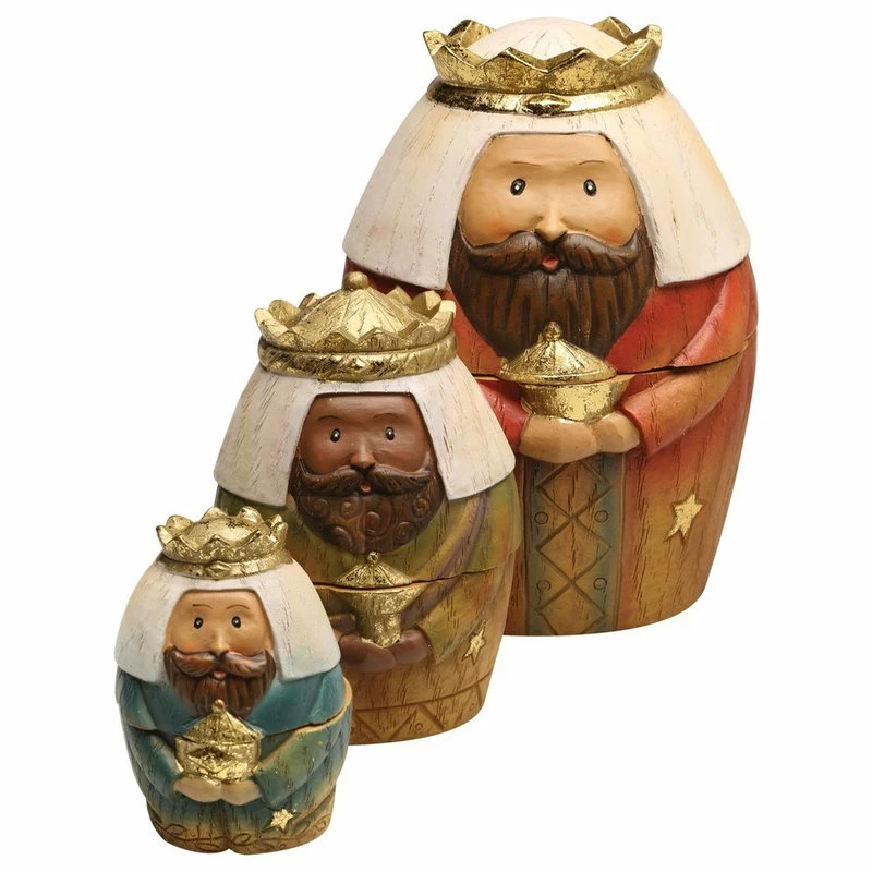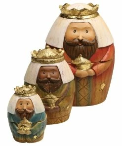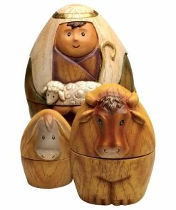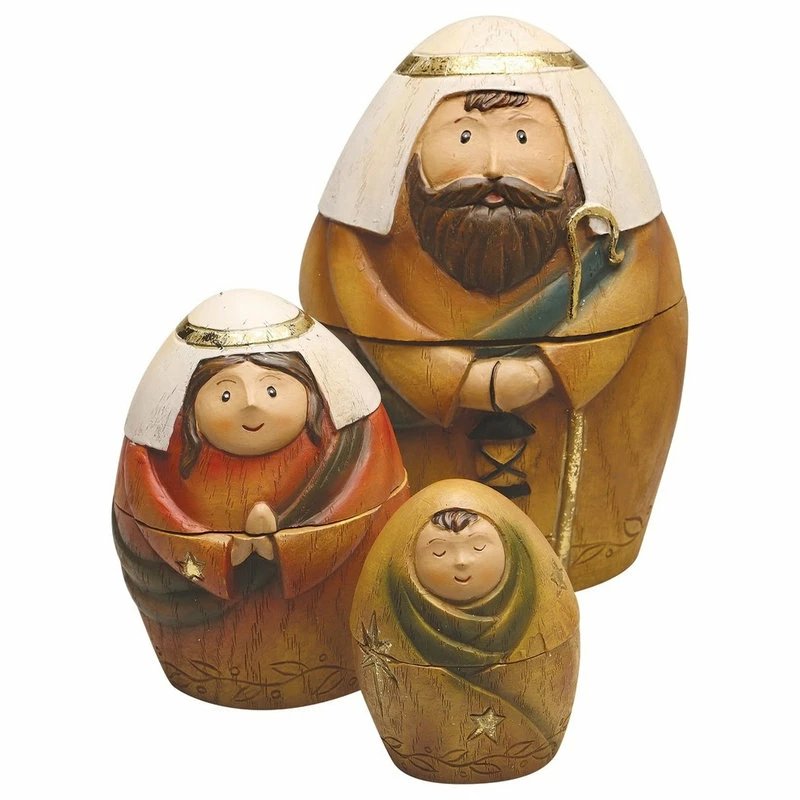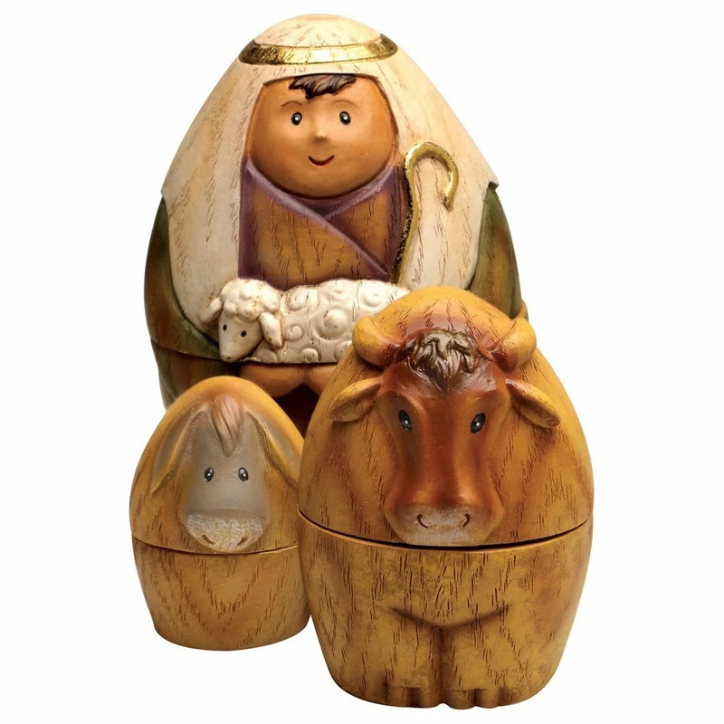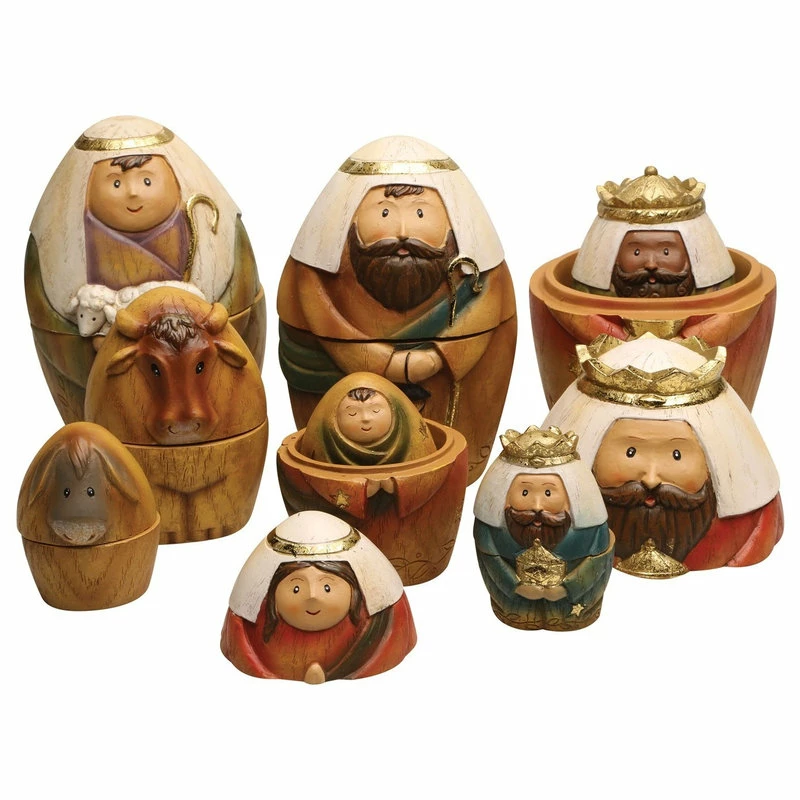 - An ingenious way to tell the Nativity story and to celebrate the season with your children/grandchildren. Nine piece set nests in threes; The Holy Family, the kings and a shepherd and animals. Resin and dolomite. The largest doll in each nest; 6″H.