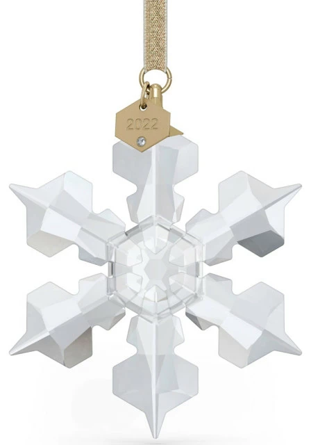 Our much-loved tradition of Swarovski Annual Edition Ornaments continues in 2022 with this beautiful crystal creation. Finely crafted with 170 facets, the clear crystal snowflake design offers a new interpretation of a classic festive motif. Hanging on a gold-tone lamΓ© ribbon, the snowflake is accented with champagne-gold tone plating. Exclusively available in 2022, its metal tag is engraved with the year and embellished with a small crystal. Decorate a tree, hang in a window, or use one of our elegant Christmas Ornament home decor Displays or Bell Jars. Decoration object. Not a toy. Not suitable for children under 15.