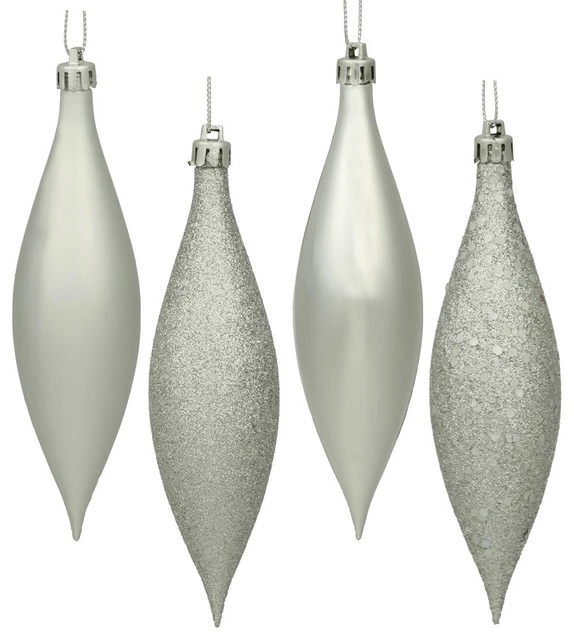 5.5″ Silver Finial 4 Finish Shiny, Matte, Glitter and Sequin Asst Shatterproof 8/Clear Acetate Box