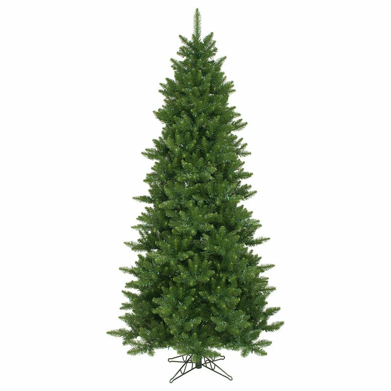 9.5′ x 54″ unlit Camdon Fir Slim tree featuring 2350 PVC tips and metal hinged branch construction. Includes metal tree stand.