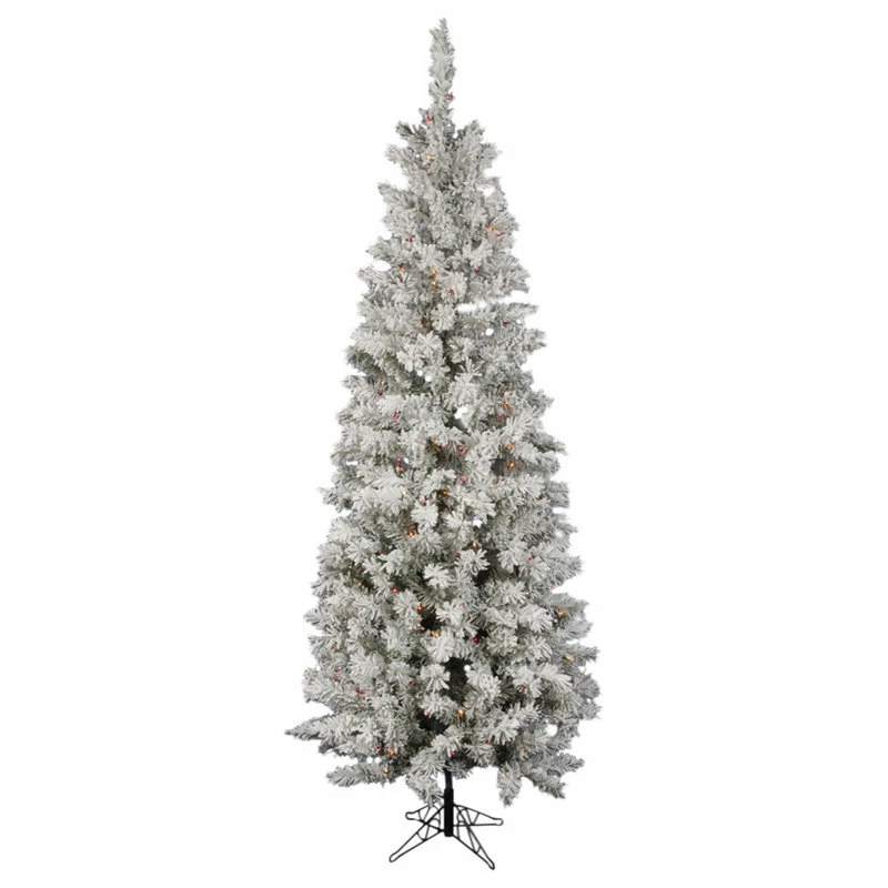 8.5′ x 40″ prelit flocked Pacific Pencil tree featuring 606 PVC tips and 500 frosted multicolored Italian LED lights. Metal tree stand is included.