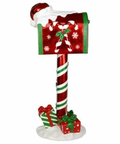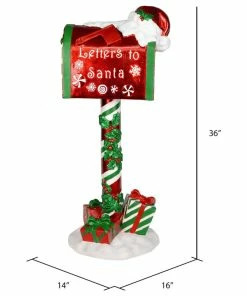 Vickerman 36″ Red Mailbox that says Letters To Santa figure. Create a festive look and feel to your Holiday decor with this whimsical Mailbox figure featuring a sturdy, gift accented base, candy stripe post with holly leaves and red berries, and a Letters to Santa sign. This accent piece is made of durable polyresin and can be used both indoors and outdoors