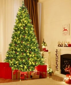 Cheap ๐ Costway 8ft Pre-lit Hinged Artificial ๐ Christmas Tree W/Pine Cones & Red Berries โญ